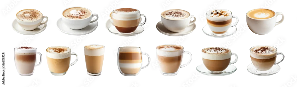 Cappuccino and latte coffee cups with milk foam topping. Assorted hot beverages served in glass and ceramic mugs. Fresh barista drinks highlight café culture and cozy mornings.