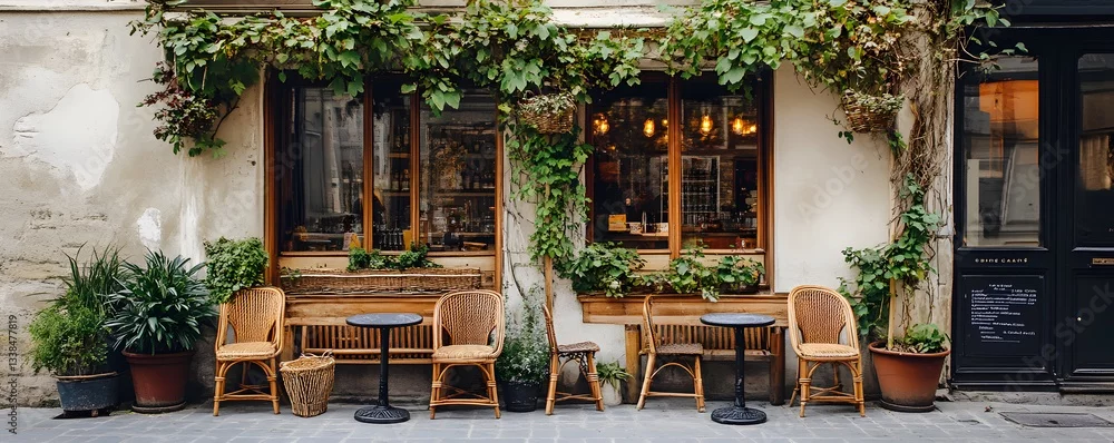 Obraz Charming parisian cafe with outdoor seating surrounded by lush greenery - do kawiarni - Picturewall.pl