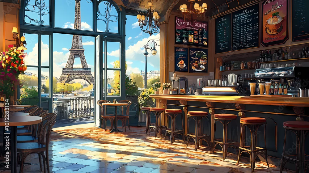 Obraz Chic parisian cafe setting in a home kitchen, complete with bistro tables, tiled floors, and french posters. Parisian Caf. Illustration - do kawiarni - Picturewall.pl
