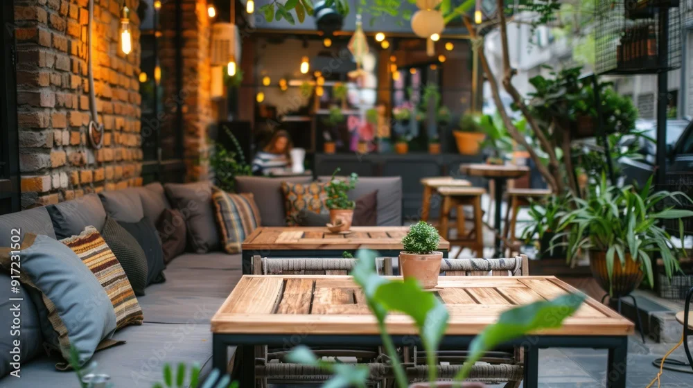 Obraz Cozy outdoor coffee shop with plants and comfortable seating