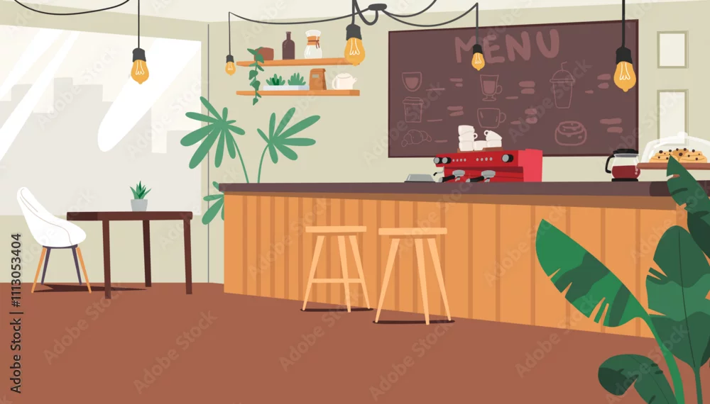 Obraz Empty no people eco-friendly cafe cozy design interior with green pants in pots vector illustration - do kawiarni - Picturewall.pl