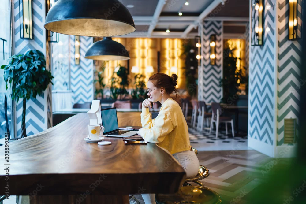 Obraz Freelance adult beautiful female sitting at table surfing laptop in modern cafe - do kawiarni - Picturewall.pl
