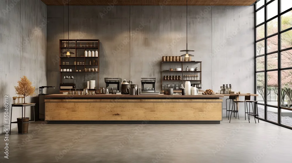 Obraz Interior of modern cafe with wooden walls, concrete floor, beige countertops and bar with stools - do kawiarni - Picturewall.pl