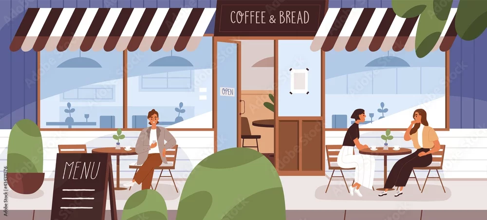 People drinking coffee on cafe terrace in summer. City bakery building with street tables and chairs. Women resting outside cafeteria. Colored flat vector illustration of customers in coffeehouse