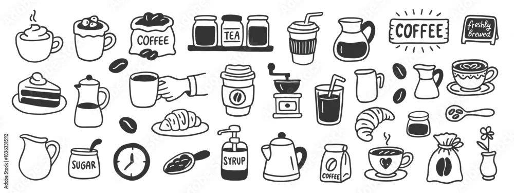 Obraz Set of hand drawn coffee doodles and cafe icons. Vector illustration of cups, beans, desserts, tea, grinder and syrup in cute sketch style for menu design. - do kawiarni - Picturewall.pl