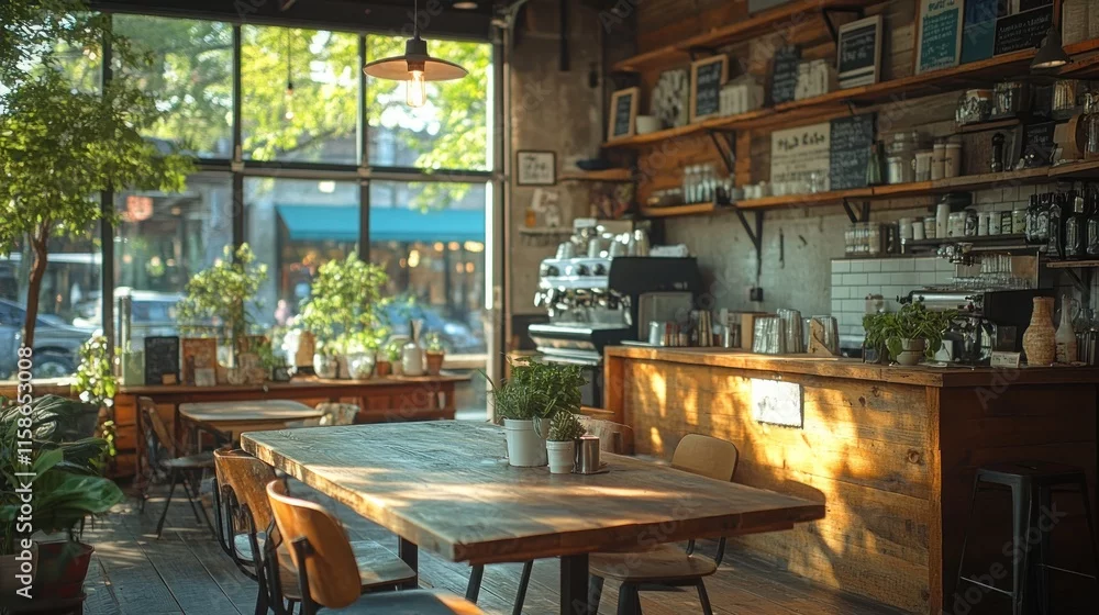 Obraz Sunny cafe interior with wooden furniture, plants, and espresso machine.