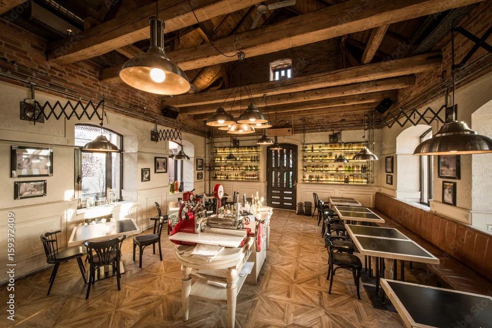 Obraz Tables and chairs in vintage loft restaurant - do kawiarni - Picturewall.pl