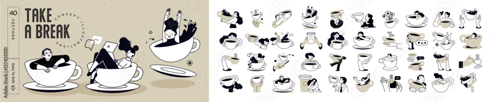 Take a break. Vector illustrations of people enjoying free time, drinking coffee, daily routine, invitation to hang out, for social media stickers and posts, marketing, restaurants and coffee bars.