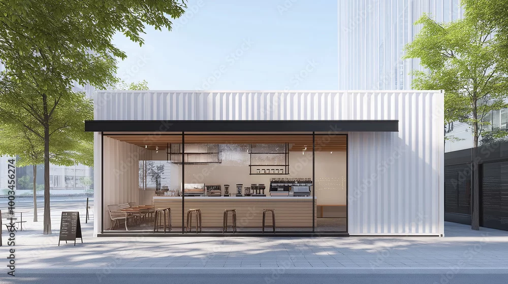 Obraz Modern coffee shop made from shipping container with large windows on sunny day - do kawiarni - Picturewall.pl