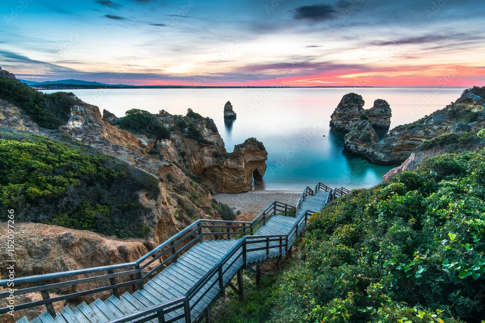 Obraz drewniane zejście na plażę w blasku zachodzącego słońca