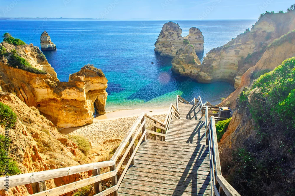 Obraz drewniane zejście na plażę wśród skał