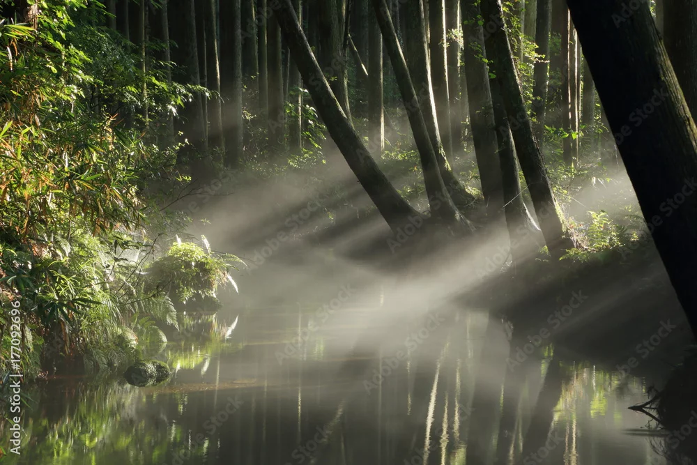 Obraz rzeka z poranną mgłą w lesie