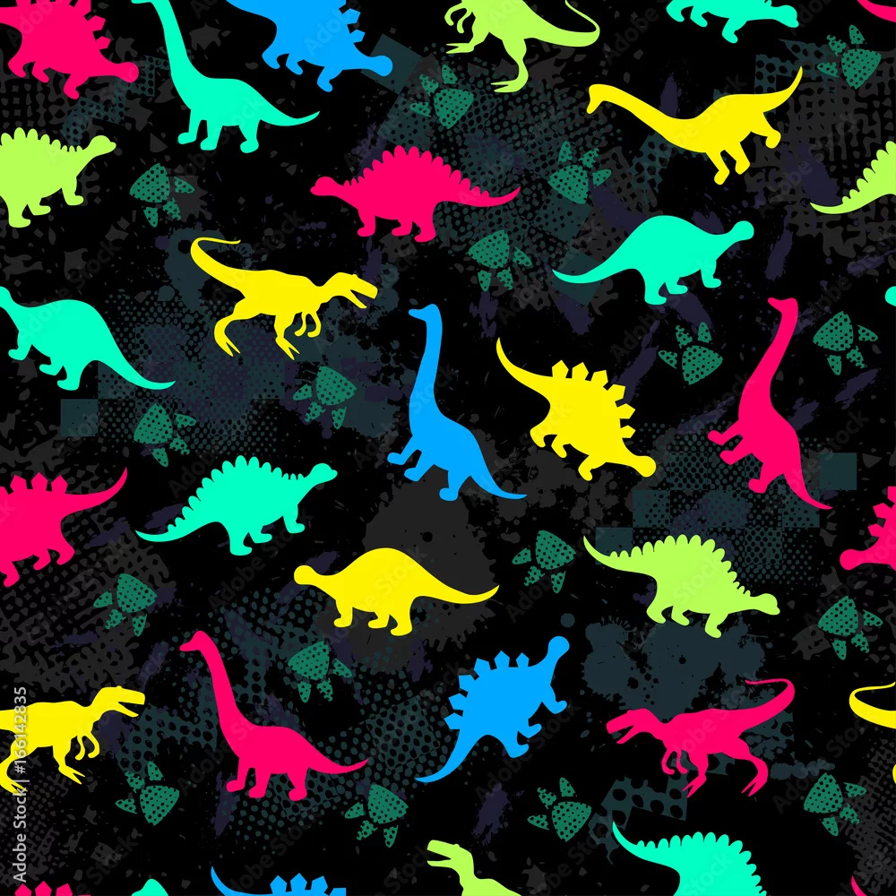 Obraz Śliczne dziecięce wzory dla dziewczynek i chłopców. Kolorowe dinozaury na abstrakcyjnym tle grunge tworzą zabawny rysunek kreskówki. Tło jest wykonane w neonowych kolorach. Tło miejskie dla tekstyliów i tkanin.