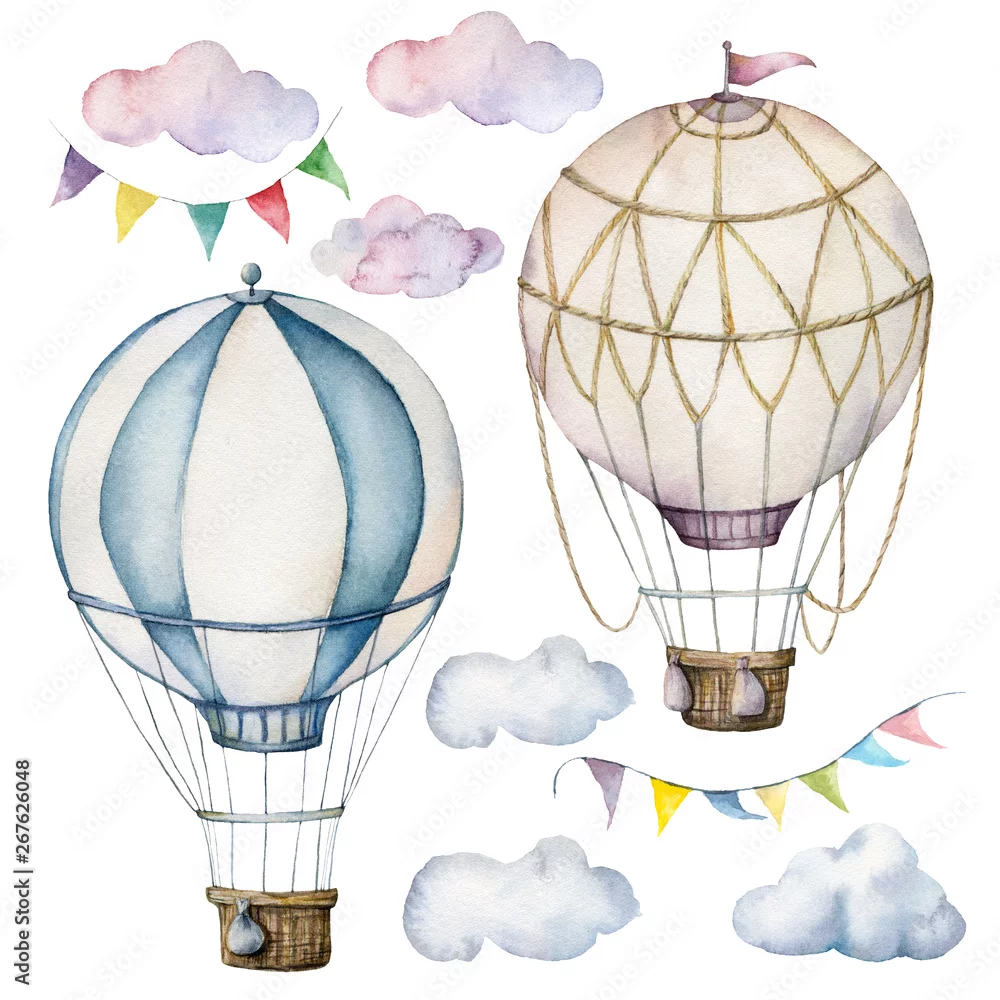 Obraz Zestaw akwareli z balonów na ogrzane powietrze i girlandą. Wręcza malującą niebo ilustrację z aerostatem, chmurami i flaga odizolowywającymi na białym tle. Do projektowania, nadruków, tkanin lub tła.
