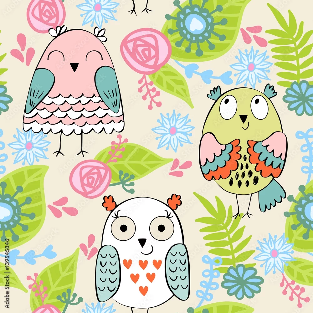 Obraz Wektorowy bezszwowy wzór z sowami i kwiatami