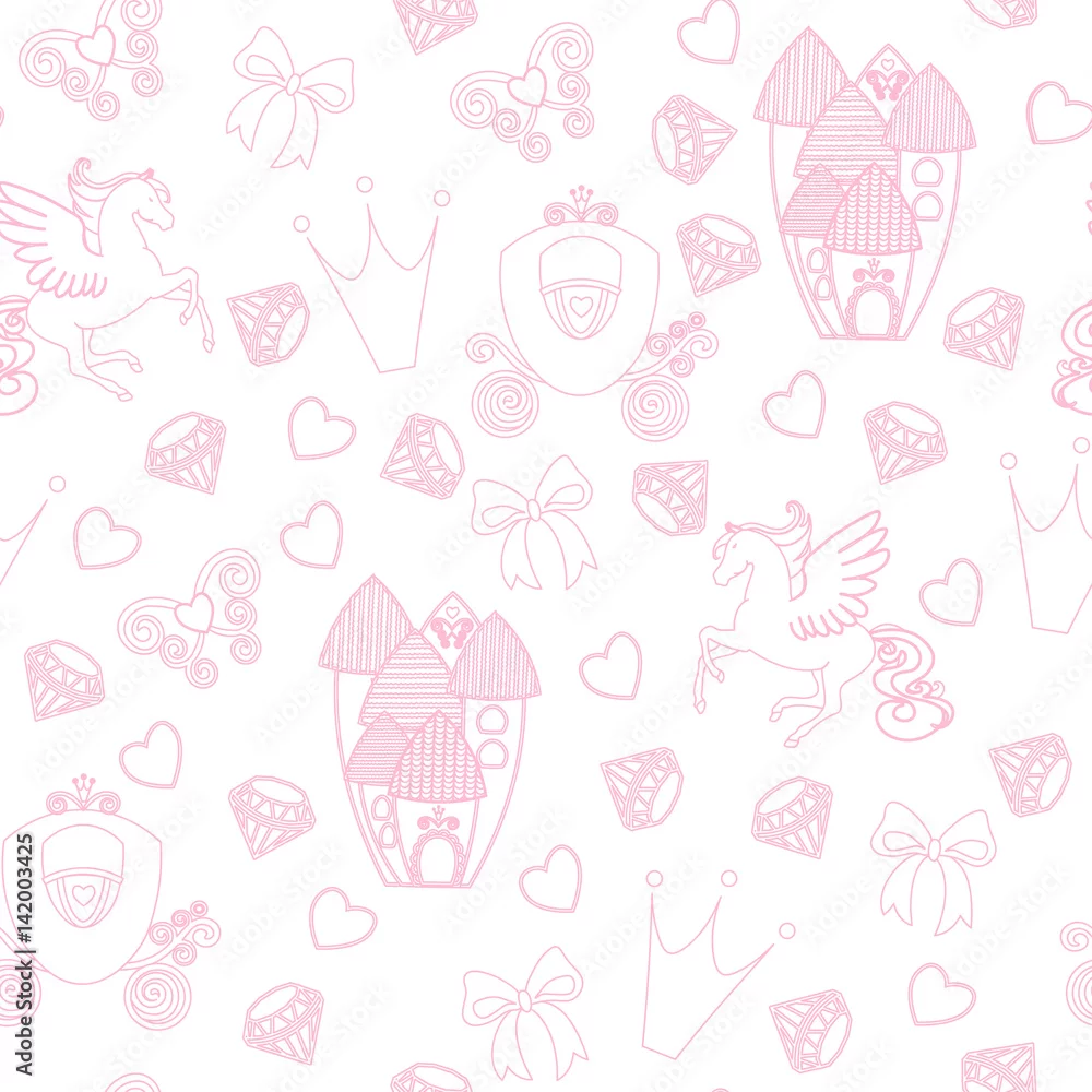 Obraz Wzór księżniczki do tekstyliów z zamku, korony, motyla, diamentu. Streszczenie wzór dla dziewczyn. Magiczne Kopciuszek ładny wektor wzór z Pegaza, zamek, przewozu.