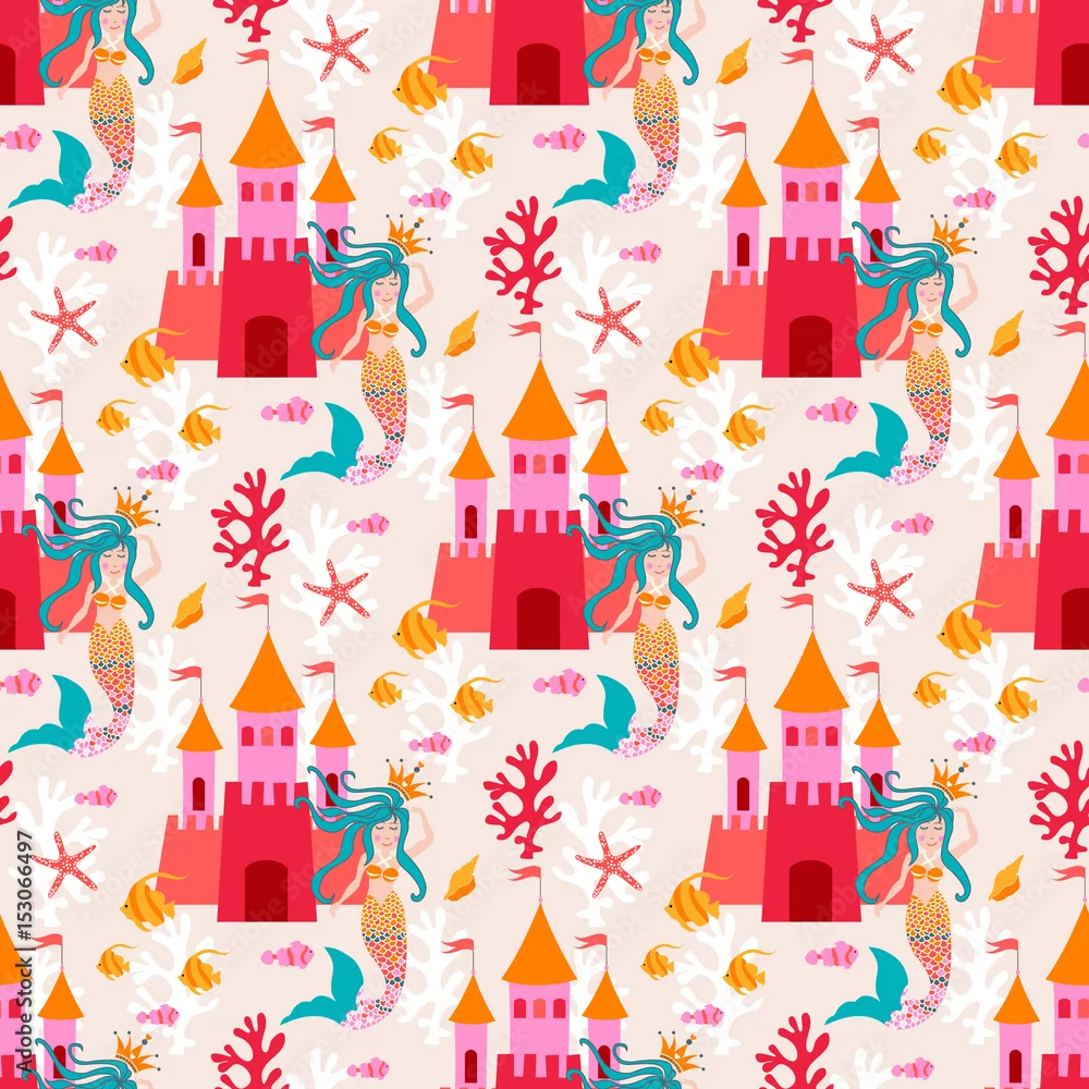 Obraz Wzór z małą syrenkę księżniczki z zamkiem. Słodki turkus podwodne tło wektor z roślin, muszli, liści koralowca, rozgwiazdy, zawilec i transparent ryby.