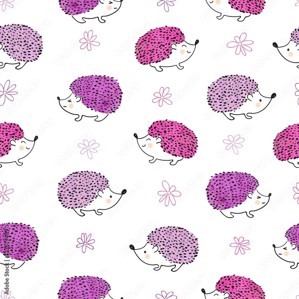 Obraz Wzór z słodkie jeże akwarela. Tło w kolorach różowym i fioletowym.
