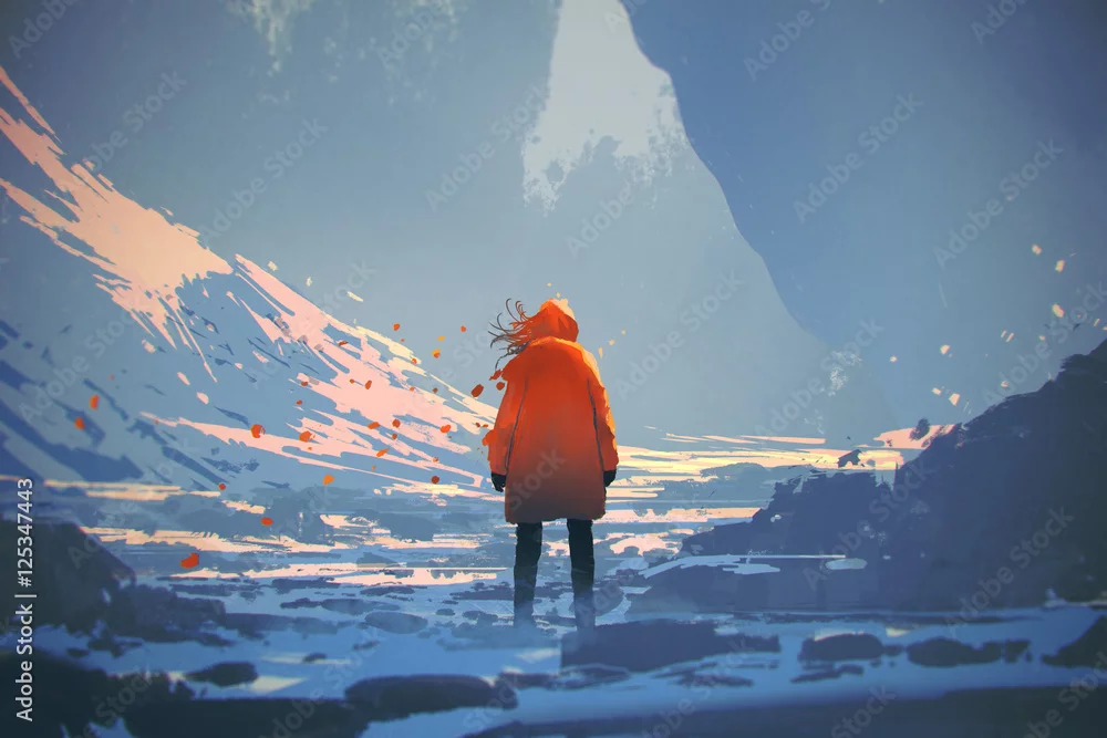 Obraz kobieta w pomarańczowym płaszczu na tle zimowego krajobrazu
