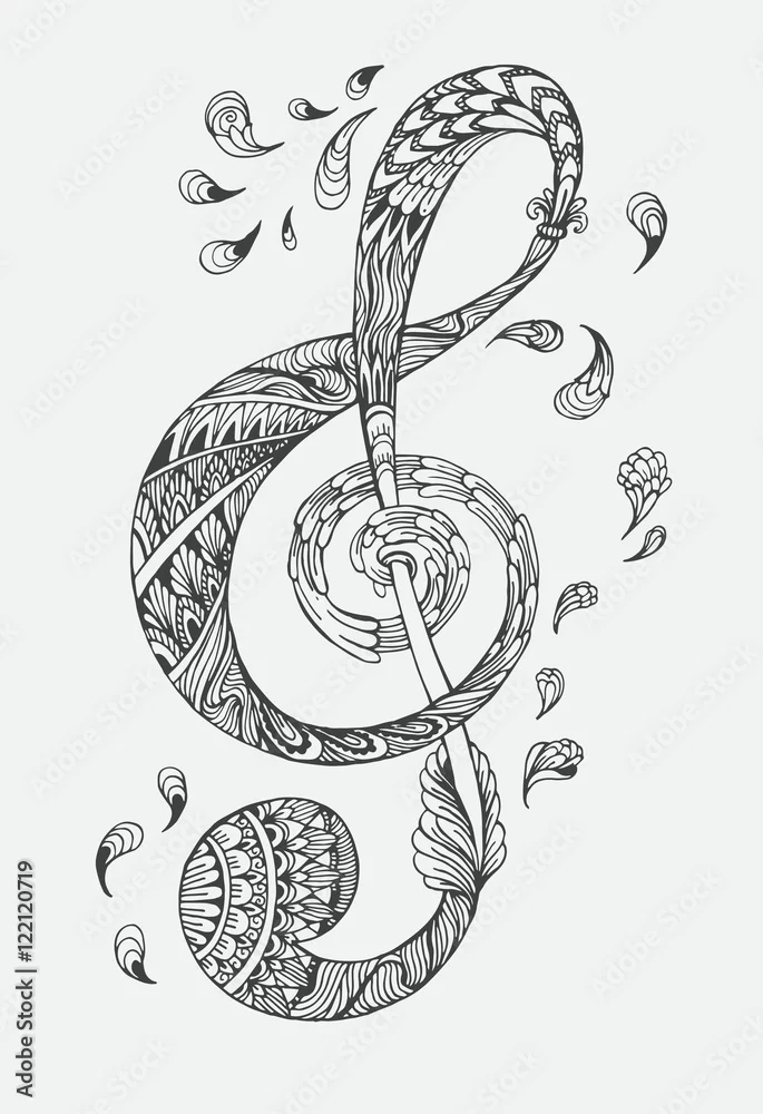 Obraz Ręcznie rysowane klucz muzyczny z etnicznymi ornamentami doodle wzór. Ilustracja wektorowa Henna Mandala Zentangle stylizowane na okładkę książki lub karty, tatuaż więcej. Zaprojektowany dla duchowego relaksu dla dorosłych. - do pokoju młodzieżowego - Picturewall.pl