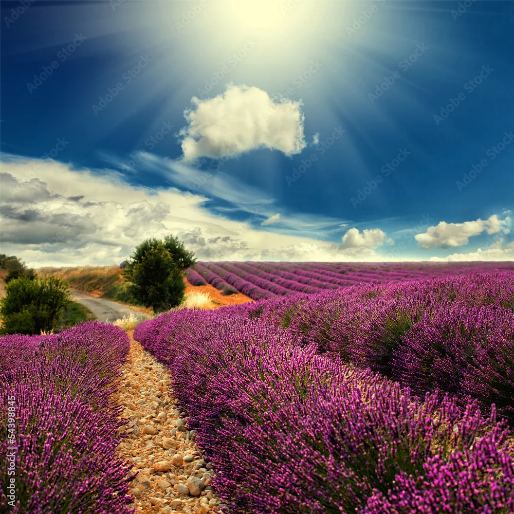 Obraz pole lawendowe w blasku słonecznych promieni - do przedpokoju - Picturewall.pl