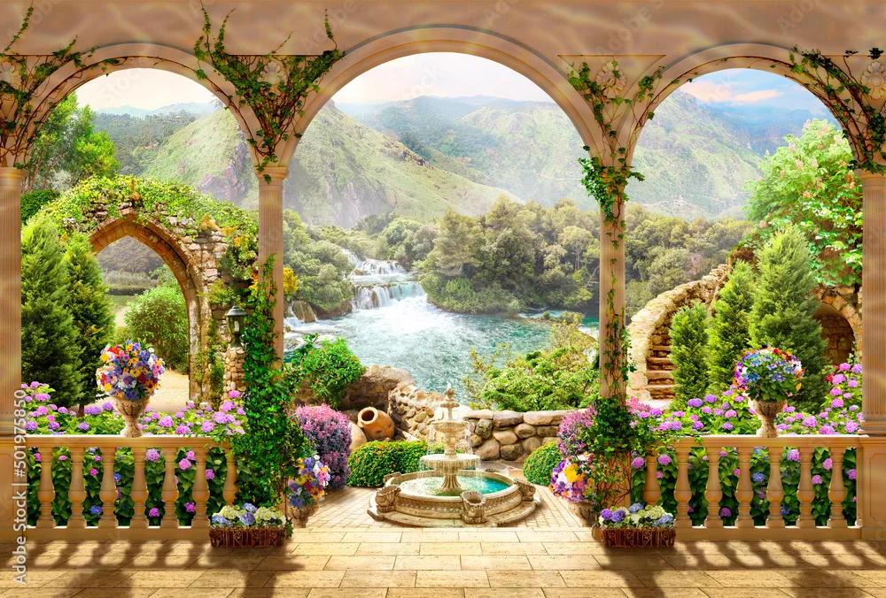 Obraz Lake in the mountains. Waterfalls, Photo Wallpapers, 3d illustration. 3d Image.