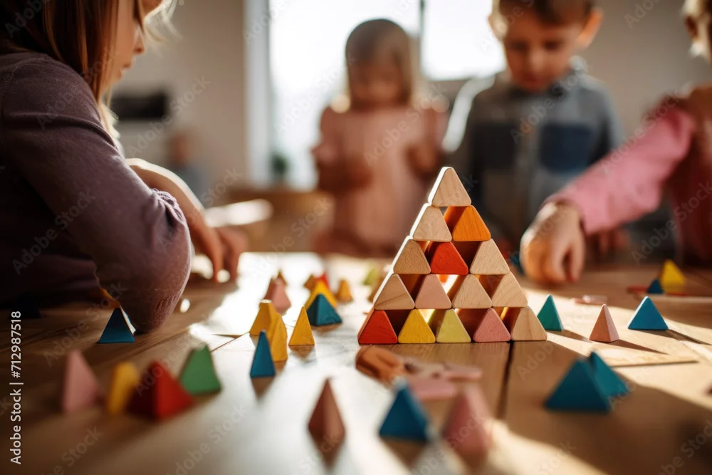 Obraz Children engage in play with colorful wooden blocks, building a pyramid structure on a table in the kindergarten - do przedszkola - Picturewall.pl