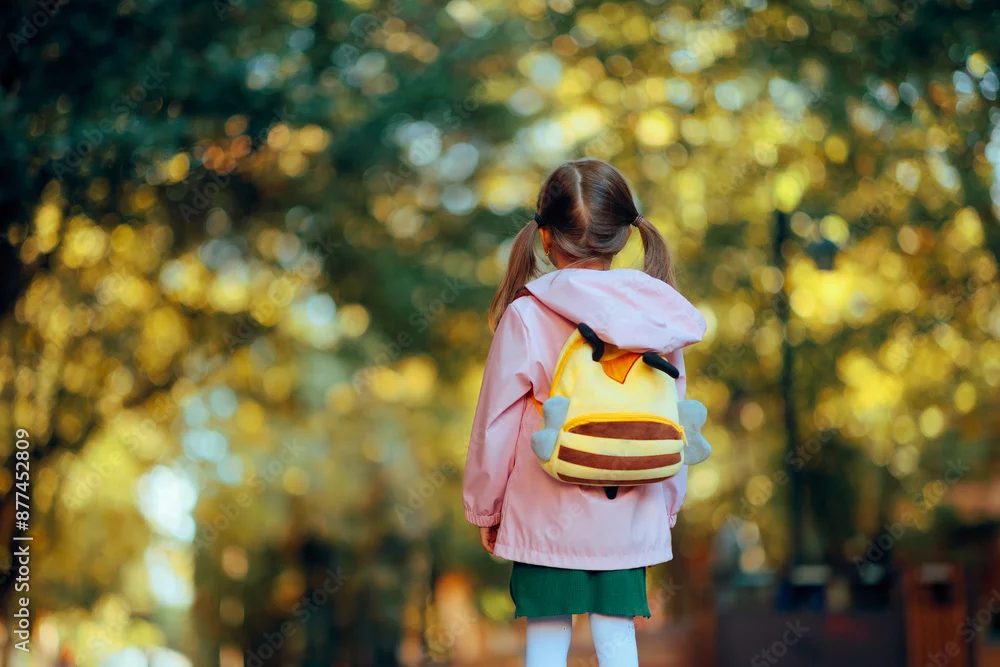 Obraz Cute Little Girl Going Back to School. Child wearing a backpack ready for the first day of kindergarten - do przedszkola - Picturewall.pl
