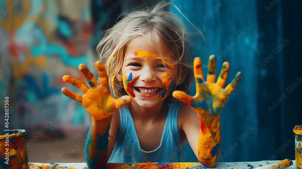 Obraz funny child girl draws laughing shows hands dirty with paint, concept joy of life - do przedszkola - Picturewall.pl