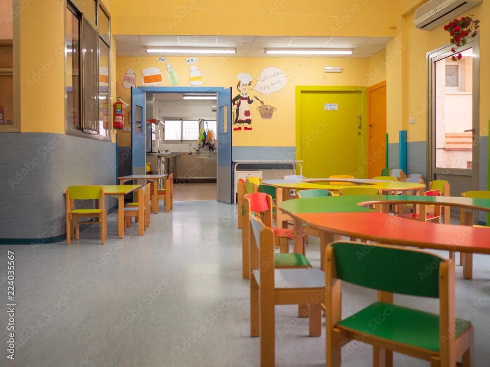 Obraz Interior diner and kitchen in kindergarten with tables and chairs for kids. Kindergarten concept. Colorful