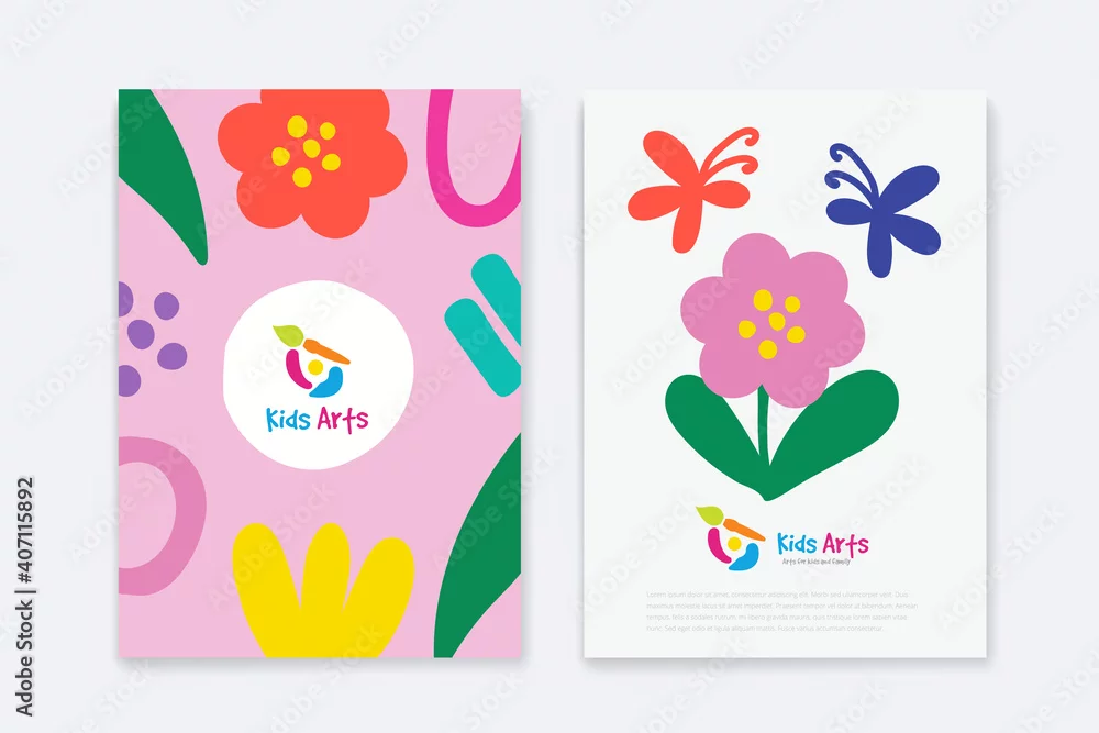 Obraz Kids Arts logo and stationery vector. Cute kids multi colored cover design for advertising brochure, Children pattern, kids menu, kindergarten poster, social media post, website background.