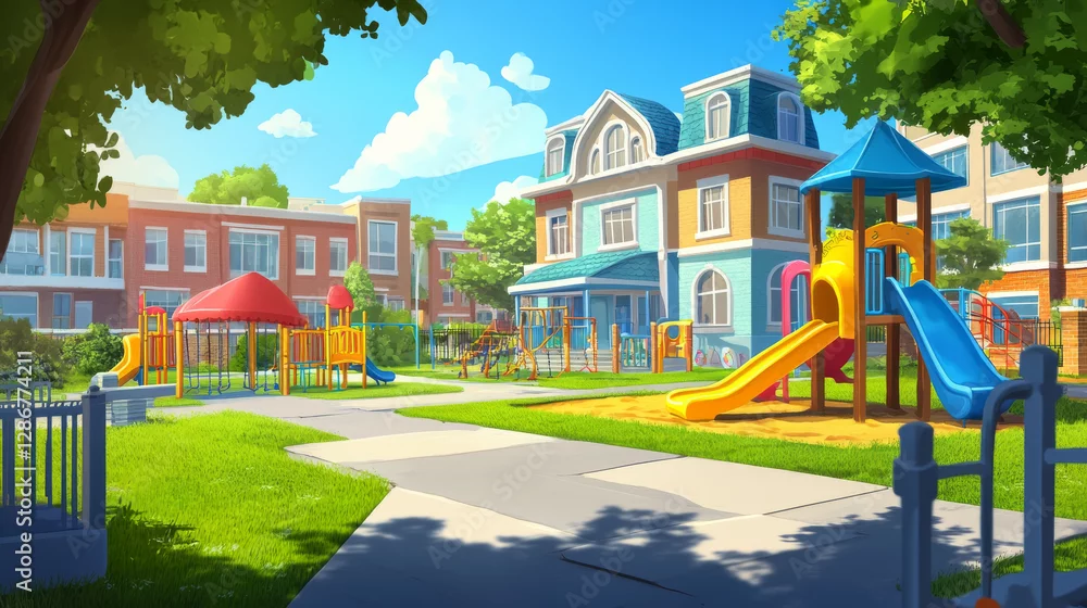 Obraz Welcome to super kindergarten poster. Vector cartoon illustration of daycare building on city street and playground with slide for kids on green lawn. Banner template for kindergarten entrance