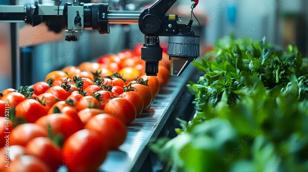Obraz A robotic arm in an automated agricultural setting, carefully processing a conveyer belt with tomatoes and leafy greens for food production.
