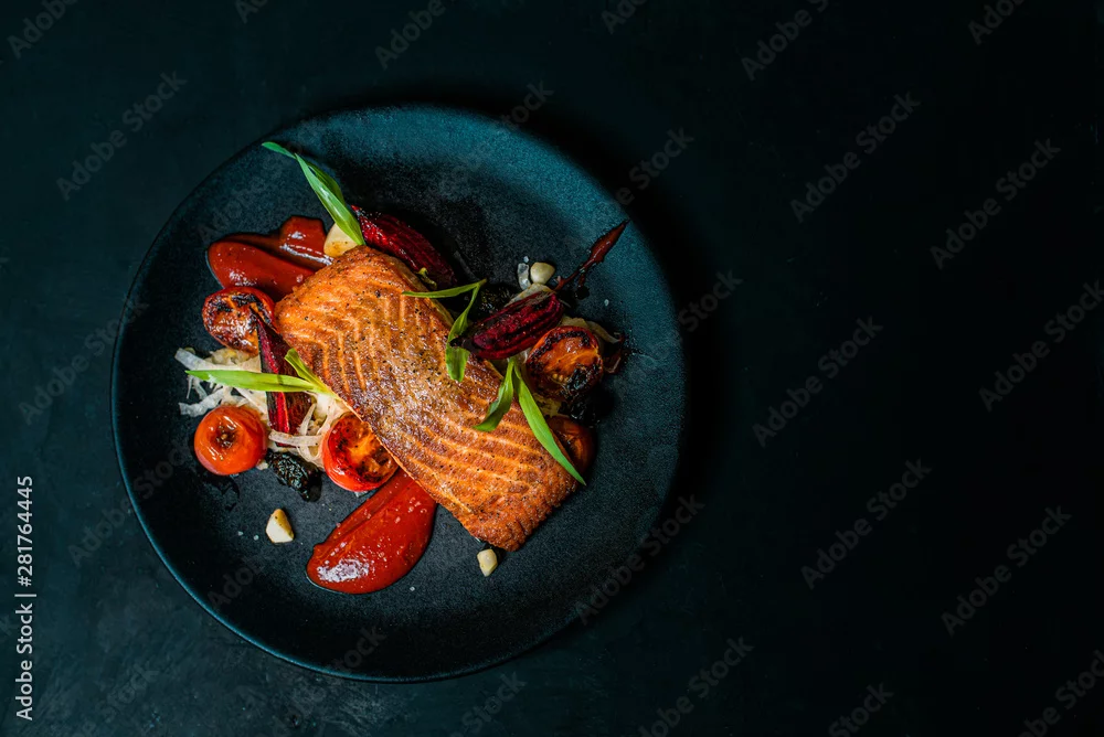 Obraz Delicious meal on a black plate, top view, copy space. - do restauracji - Picturewall.pl