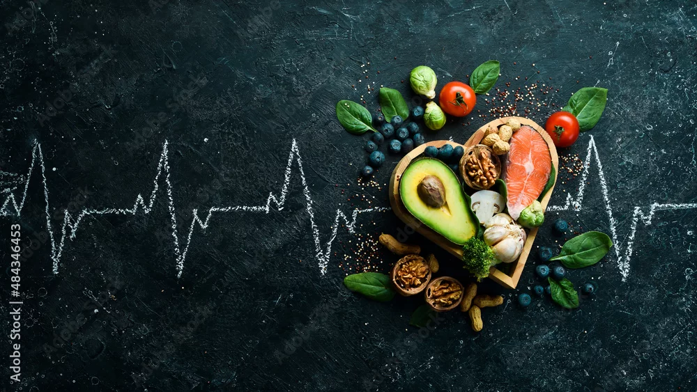 Food banner. Healthy foods low in carbohydrates. Food for heart health: salmon, avocados, blueberries, broccoli, nuts and mushrooms. On a black stone background. Top view.