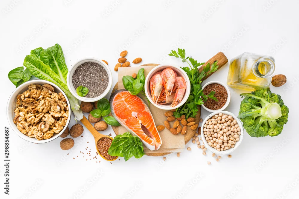 Obraz Food sources of omega 3 and omega 6 on white background top view. Foods high in fatty acids including vegetables, seafood, nut and seeds - do restauracji - Picturewall.pl