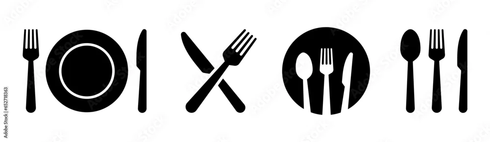 Obraz Fork, knife, plate and spoon. Menu symbol. Restaurant icon. Food, plate, fork, knife, spoon, cutlery icon set. Vector