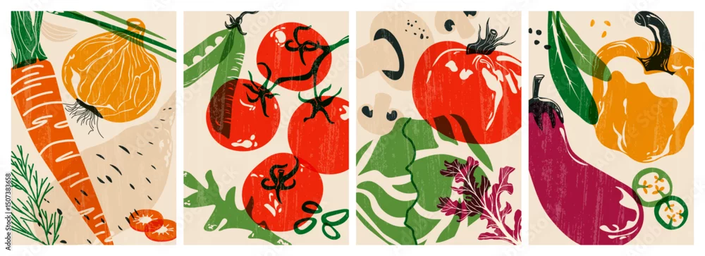 Obraz Fresh vegetable posters. Organic veggies natural food farm products for healthy diet, tomato pepper onion greens risograph covers for vegetarian restaurant menu. Vector cartoon set - do restauracji - Picturewall.pl