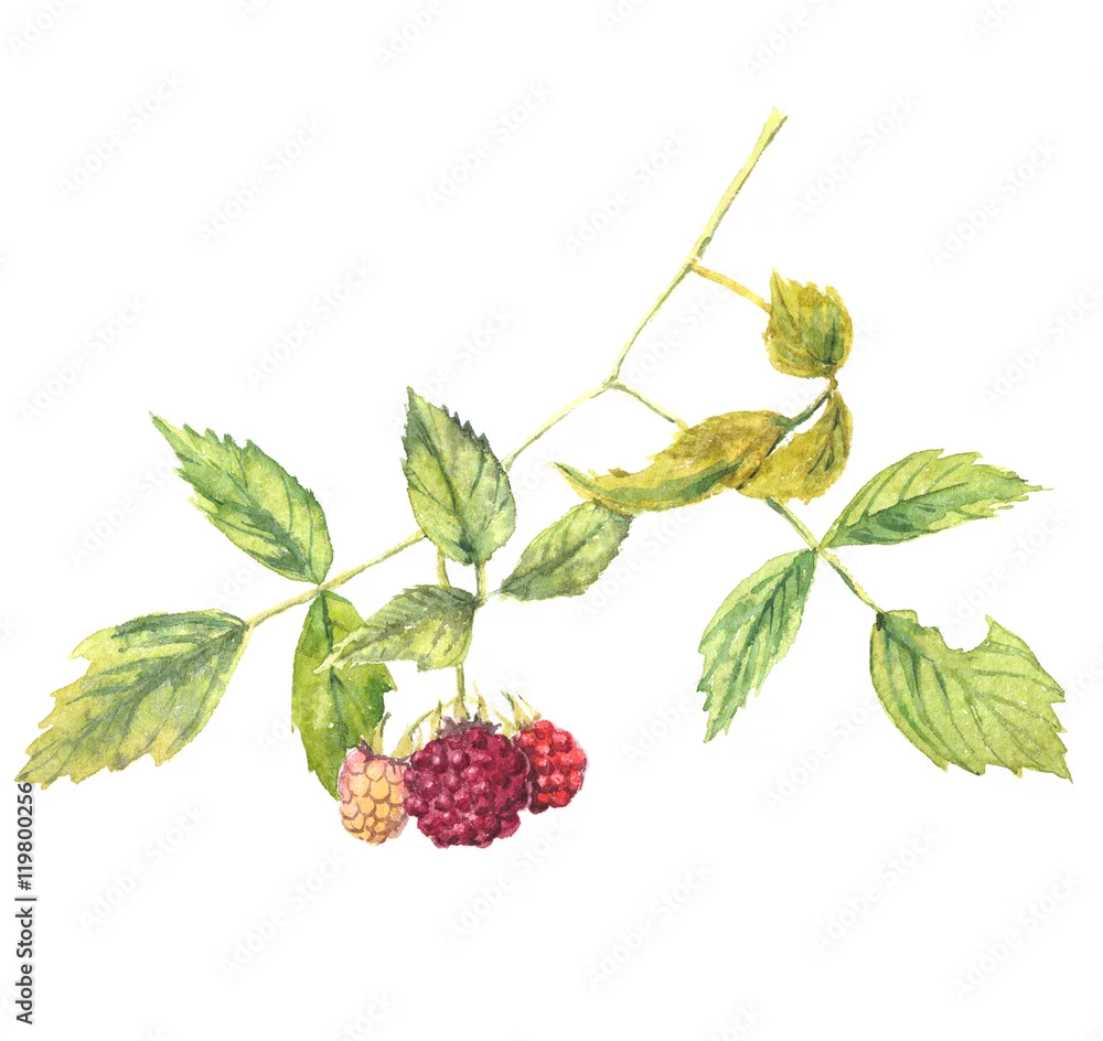 Obraz Gałąź malin - realistyczne malarstwo akwarelowe. Pojedynczo na białym tle.