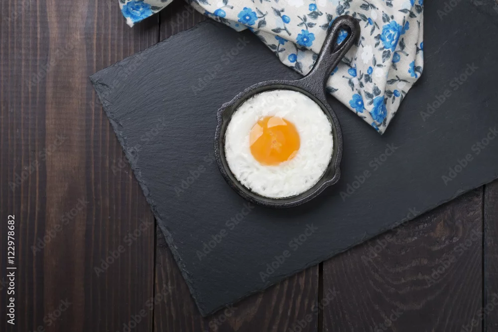 Obraz jajko sadzone na małym czarnym i drewnianym tle cocotte