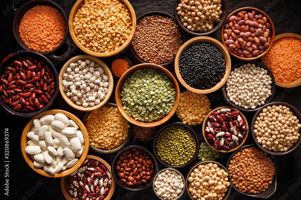 Legumes, a set consisting of different types of beans, lentils and peas on a black background, top view. The concept of healthy and nutritious food