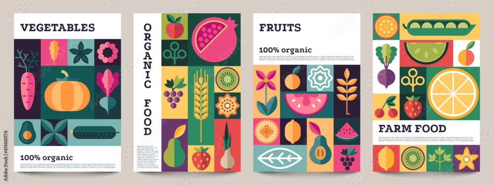Obraz Organic food geometric poster. Minimal abstract layout of nature organic vegetables for food label or package. Vector vegan brochure cover collection - do restauracji - Picturewall.pl