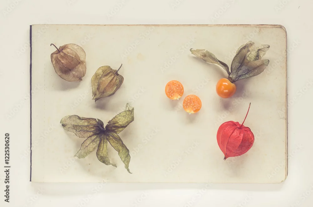 Obraz pęcherzyca leżąca na arkuszach rocznika papieru - styl książki historii naturalnej