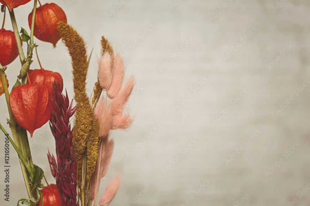 Obraz piękny bukiet suszonych kwiatów. Szary streszczenie tło. przetwarzanie vintage, wolne miejsce na tekst lub obraz