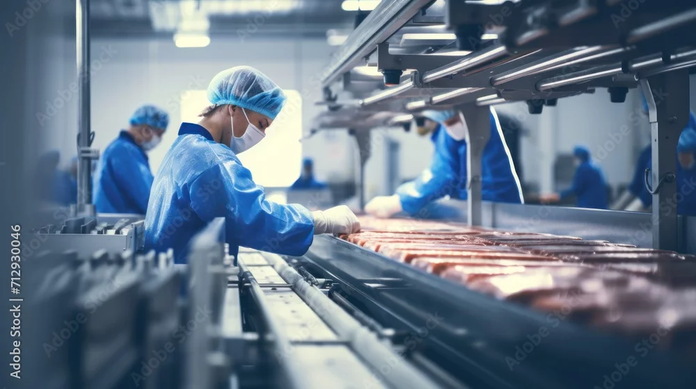 Obraz Production line in the food factory.Factory for the production of food from meat.Industrial equipment at a meat factory.Automated production line in modern food factory.People working.