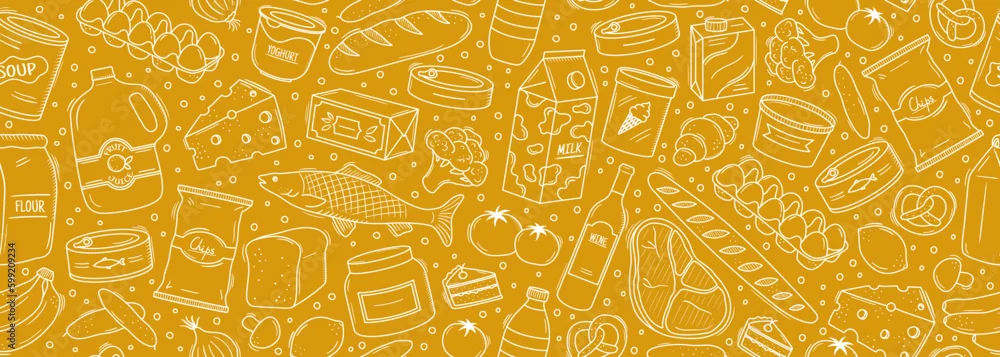 Seamless vector banner with hand drawn supermarket products illustrations. Background with doodle food sketches. Concept for grocery delivery and shopping. Cooking ingredients pattern