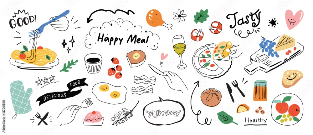 Obraz Set of cute food doodle elements vector. Hand drawn doodle collection of pizza, bread, mushroom, pasta, egg, strawberry, coffee. Design for print, cartoon, wallpaper, restaurant, cafe, sticker.