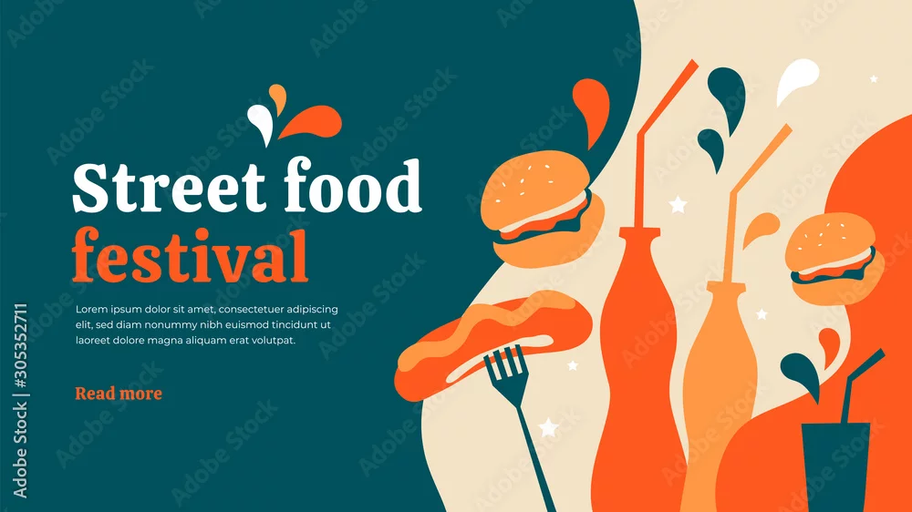 Vector illustration with hot dog sausages, burgers and drink. Street Food Festival concept design, poster or layout. Fast food store on wheels, cart. Template for banner, flyer, menu, bbq, truck, cafe