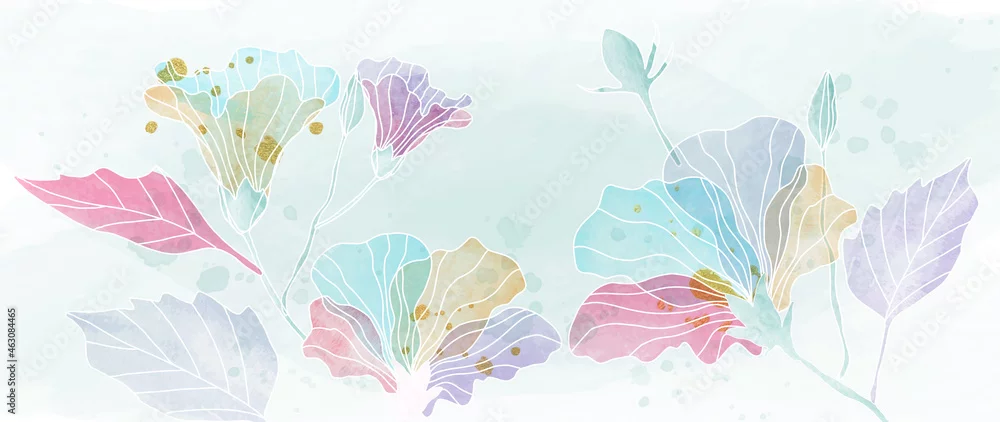 Obraz Watercolor art background vector. Wallpaper design with winter flower paint brush line art. Earth tone blue, pink, ivory, beige watercolor Illustration for prints, wall art, cover and invitation.