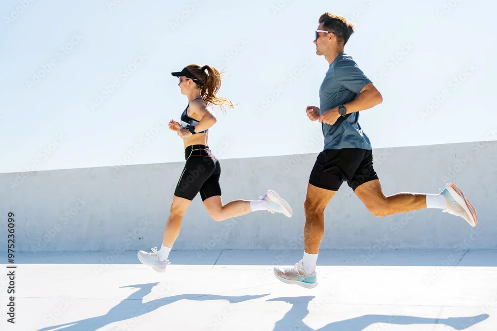 Obraz A man and woman are seen running outdoors under bright sunlight, their shadows cast long on the ground. - do siłowni - Picturewall.pl